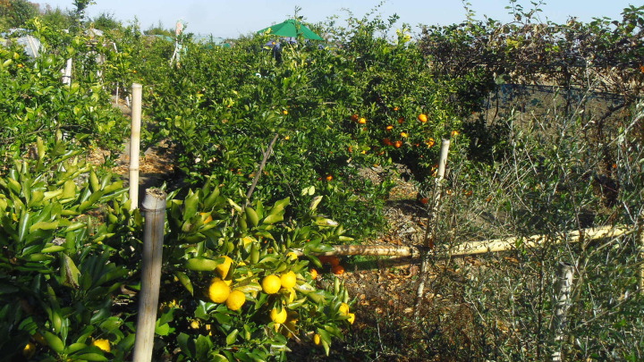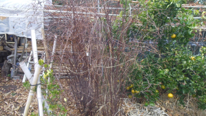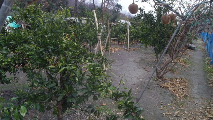 春分の日を過ぎ、寒の戻りは有るかもだが、ミカン寒囲いネットの南と東側を解放した。元気に冬を越した様で一安心する(写真ー5)。