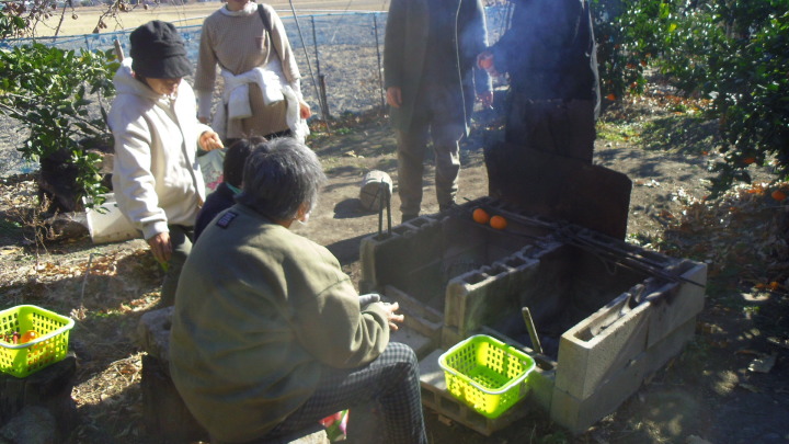 寒い朝、みかんを焼いて食べる客。ジュースみたいと燥ぐ。そしてみかん園のみかん探す程になる(写真ー6) |