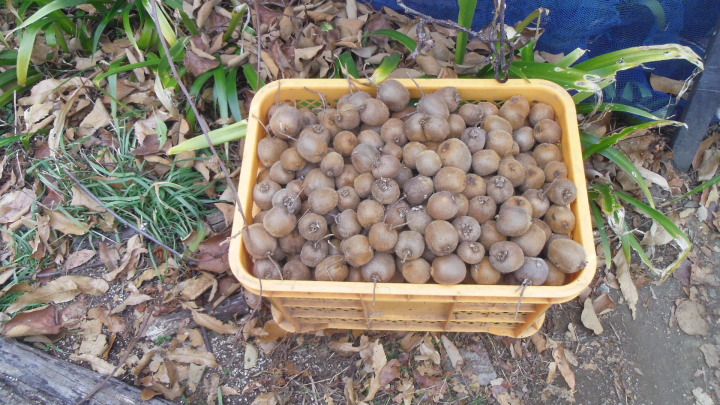 合間を見てサツマイモのベニハルカを掘るが出来が悪い(写真ー5)。キウイのゴールドと言う早生の品種を全て採る(写真ー6)。おお過ぎて処理に困る。 |