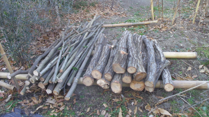コナラ山から今年も榾木を伐り出し、更に丸太杭や支柱材を伐り出し畑に搬入(写真ー6)。山の木材や竹は重宝に利用する