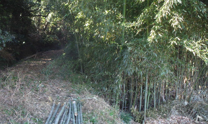 畑は一面の霜柱に覆われる(写真ー1)。早朝は畑の農作業が出来ない。知人の竹林へ行き竹を伐り出し杭にする(写真ー2)。