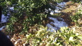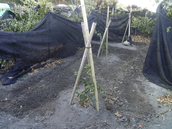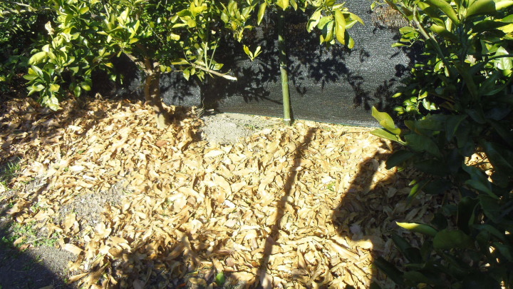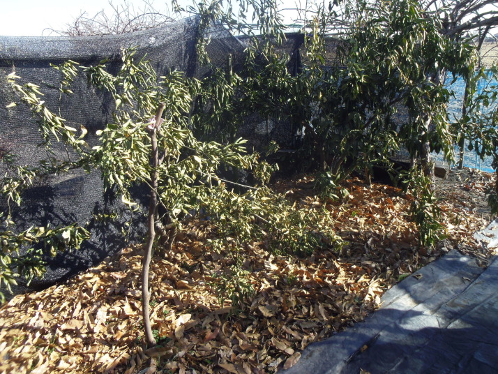 そしてミカン畑全面に防寒ネットを掛ける(写真ー3)。強風でネットの固定が弱いと風に煽られ外れる(写真ー4)。そしてミカンの根元が凍ラぬ様落葉養生をする(写真ー5)。防寒ネットが無いと根元に置いた落葉が全て風邪で飛ばされてしまう。ネットは落葉の固定に必須だ。