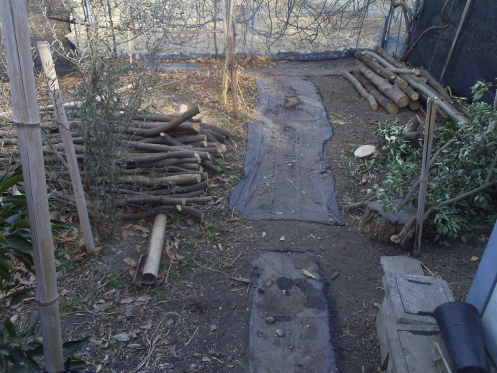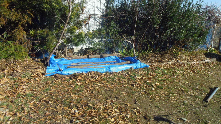 毎日氷点下の冷え込み、北風が強く寒い。冬は山仕事、コオナラ山で白樫を伐倒し丸太を畑に搬入する(写真ー1)。ミカン養生で根廻りに入れた落葉が北風で飛散する(写真ー2)。防寒ネットの裾から北風が吹き込み落葉を散らすのでネットの裾を伐り出した丸太で押える(写真ー3)。丸太は大変重宝だ。