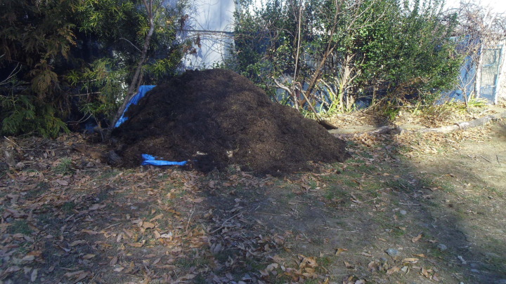荒川河川の草を刈り発酵させた緑肥を毎年頂くが、畑に近い東松山は量が少なく今年は朝霞ヤードで1屯確保した。知人のご厚意でトラックで朝霞ヤードへ行き緑肥を積込み(写真ー1)、60Km離れた畑へ搬入した(写真ー2)。畑を耕す度に施肥して来年まで使う為ブルーシートを掛けて養生した(写真ー3)。