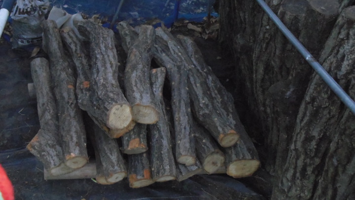 今年もコナラ山からシイタケホダ木を伐り出した。夏、高温で雨不足の為かシイタケの出来が悪く、今年は13本に減らし植菌した(写真ー4)。そして圃場に伏せた(写真ー5)。