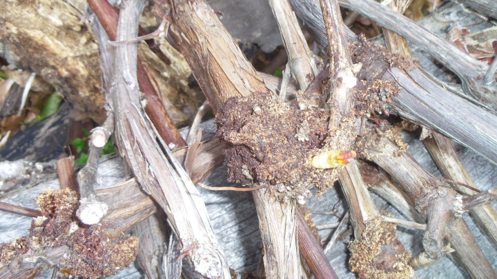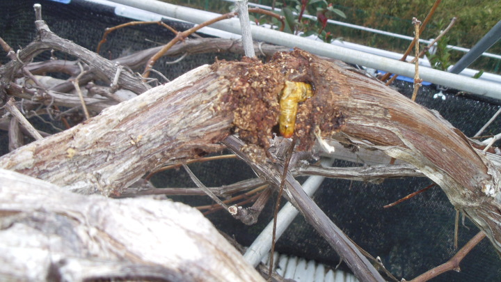 キウイの剪定を終え次にブドウの剪定をした(写真ー1)。ブドウの蔓にブドウスカシバの食害が散見され、驚いた幼虫が這い出した(写真ー2)。(写真ー3)は食害枝を切り出した物です。